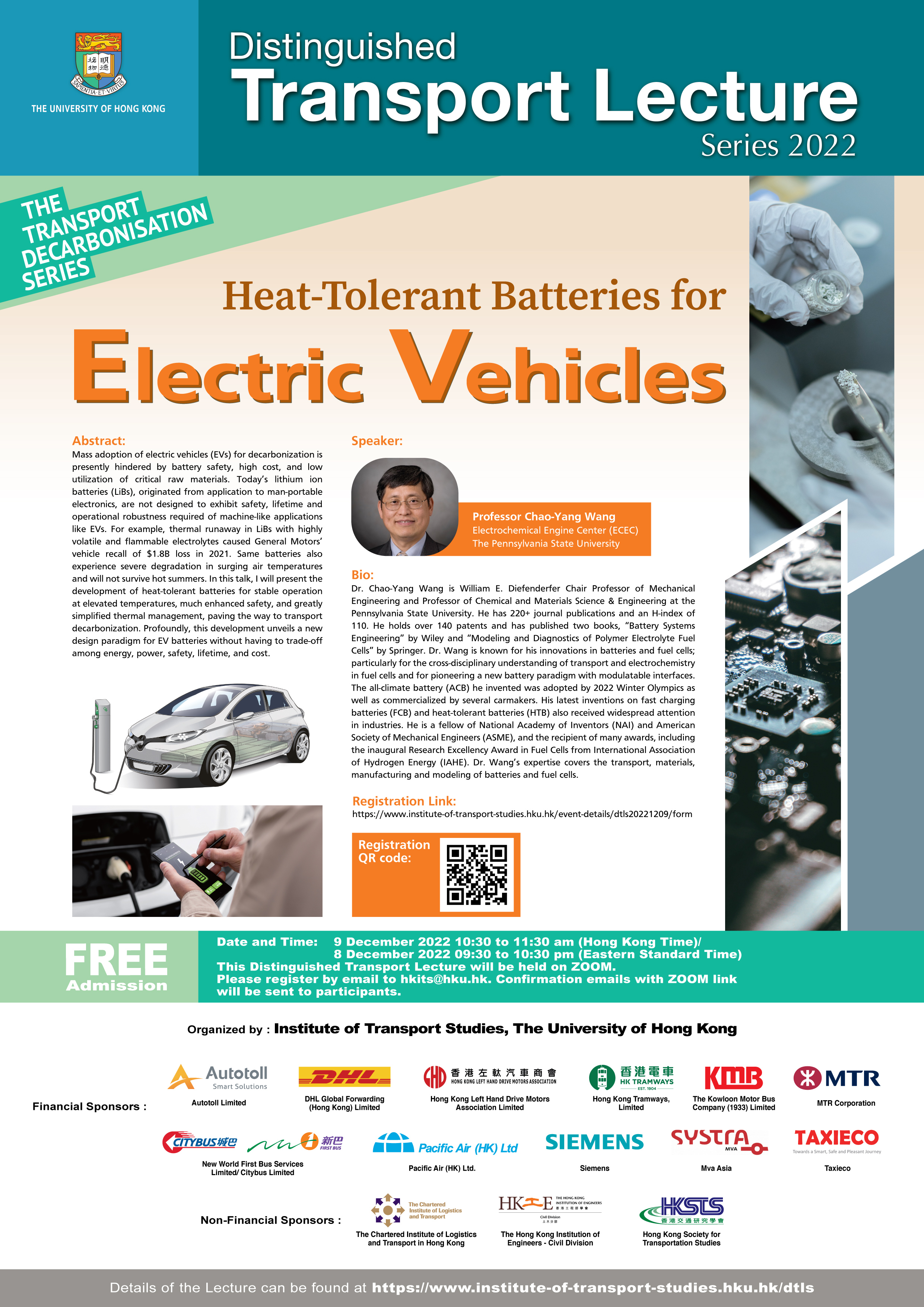 The Pennsylvania State University Mass adoption of electric vehicles (EVs) for decarbonisation is presently hindered by battery safety, high cost, and low utilisation of critical raw materials. Today's lithiumion batteries (LiBs), originated from application to man-portable electronics, are not designed to exhibit safety, lifetime and operational robustness required of machine-like applications like EVs. For example, thermal runaway in LiBs with highly volatile and flammable electrolytes caused General Motors' vehicle recall of $1.8B loss in 2021. Same batteries also experience severe degradation in surging air temperatures and will not survive hot summers. In this talk, I will present the development of heat-tolerant batteries for stable operation at elevated temperatures, much enhanced safety, and greatly simplified thermal management, paving the way to transport decarbonisation. Profoundly, this development unveils a new design paradigm for EV batteries without having to trade-off among energy, power, safety, lifetime, and cost.