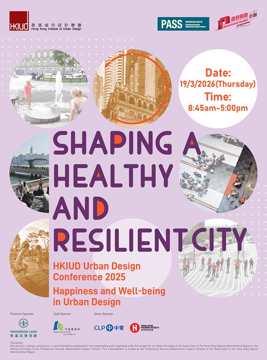 The Hong Kong Institute of Urban Design (HKIUD) is hosting the Conference themed "Happiness and Well-being in Urban Design: Shaping a Healthy and Resilient City”. Through keynote speeches and panel discussions, international keynote speakers and local panelists will share best practices, case studies, and visionary ideas illustrating how urban design can transform cities—especially Hong Kong—into happier, healthier, and more sustainable places to live, to work and thrive. By prioritizing well-being in urban design, we can cultivate communities that not only survive but also thrive, ultimately leading to a more joyful urban experience for all.