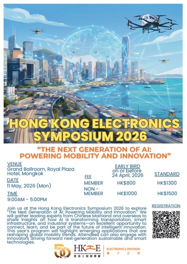 The Electronics Division of The Hong Kong Institution of Engineers is organizing the 14th Annual Symposium “Hong Kong Electronics Symposium 2026 (HKES 2026)” on Monday, 11 May 2026 on the development and application of Electronics in the world.