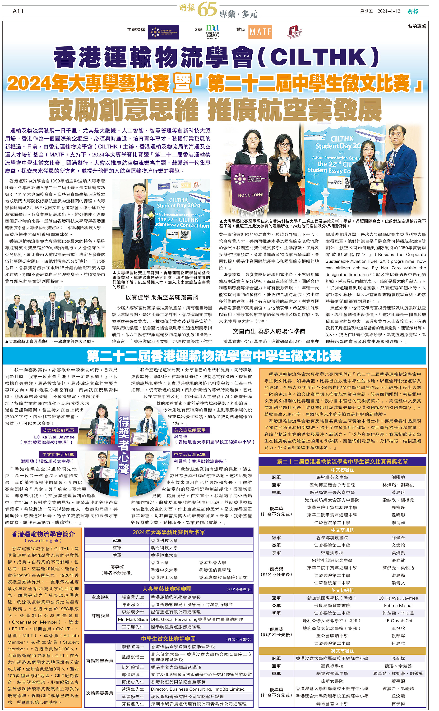 Both Student Day 2024 and the 22nd Essay Competition were smoothly held. Award Presentation Ceremony was held at the Hong Kong Metropolitan University on 16th March 2024. A full report have been published on Ming Pao on 12th April 2024 and in the upcoming CILTHK Newsletter Issue 89.