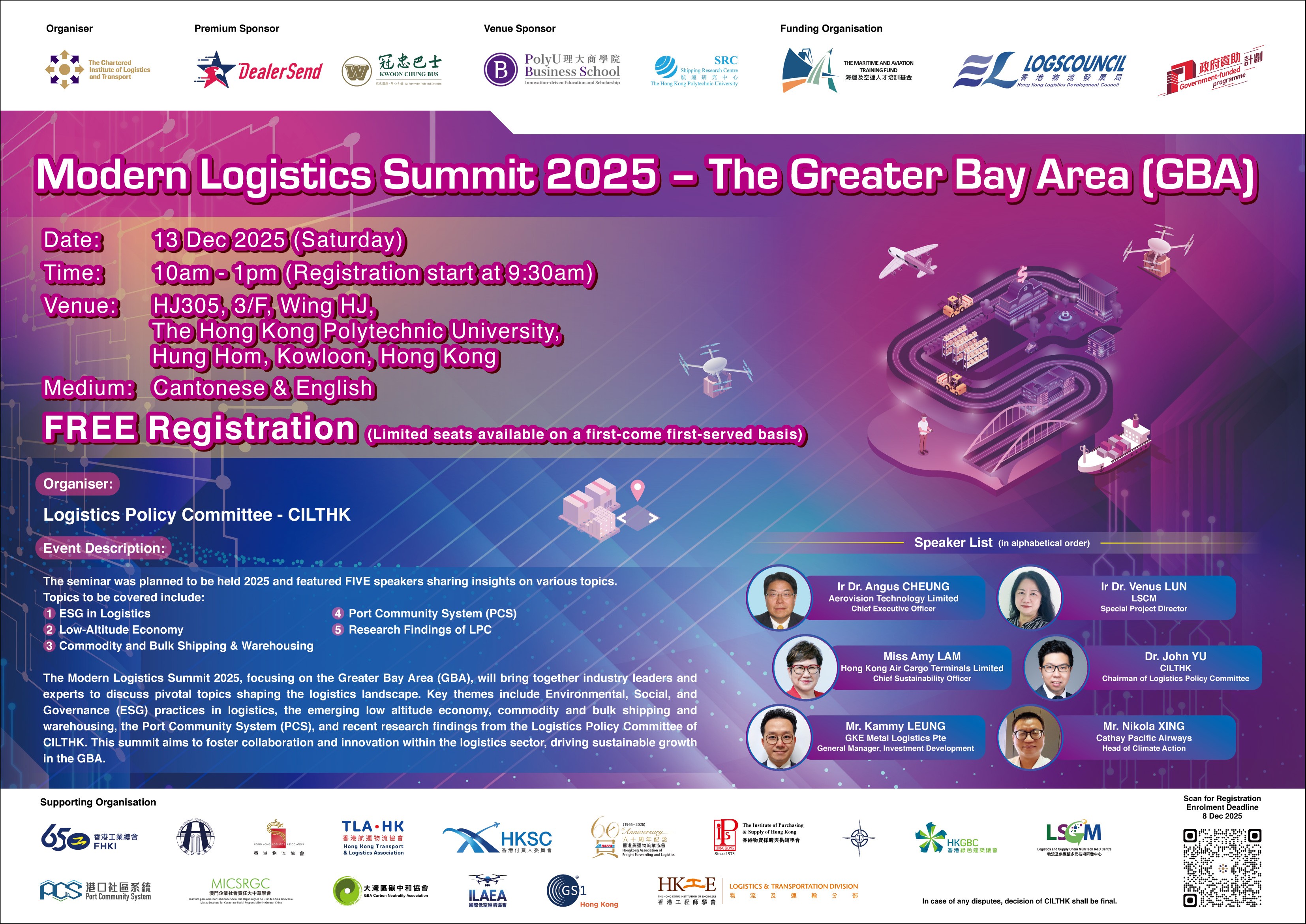 CILTHK is honourable to invite Ms. Amy Chan, Deputy Secretary for Transport and Logistics, as the guest of honour for this significant event. The summit will focus on the Modern Logistics in the GBA and will bring together industry leaders and experts to discuss pivotal topics shaping the logistics landscape. Key themes will include: - Environmental, Social, and Governance (ESG) practices in logistics - The emerging low altitude economy - Commodity and bulk shipping and warehousing - The Port Community System (PCS) - Recent research findings from the Logistics Policy Committee of CILTHK This Summit aims to foster collaboration and innovation within the logistics sector, driving sustainable growth in the GBA. Participants could get 40 CPD Points joining the Summit. Registration is free, but seats are limited and will be allocated on a first-come, first-served basis. We encourage you to secure your spot by registering by 8 December 2025. Don’t miss this opportunity to engage with industry leaders and contribute to the future of logistics in the Greater Bay Area. To register, please click here.