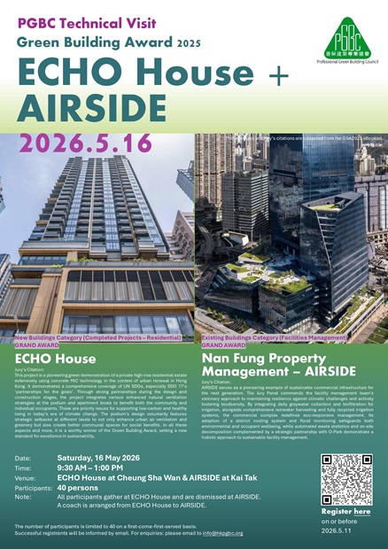PGBC is organising a Technical Visit to Green Building Award 2025 Grand Award Winning Projects - ECHO House & AIRSIDE on Saturday, 16 May 2026. Details of the visit are as follows: Date: 16 May 2026 (Saturday) Time: 9:30am – 1:00pm Venue: ECHO House at Cheung Sha Wan & AIRSIDE at Kai Tak