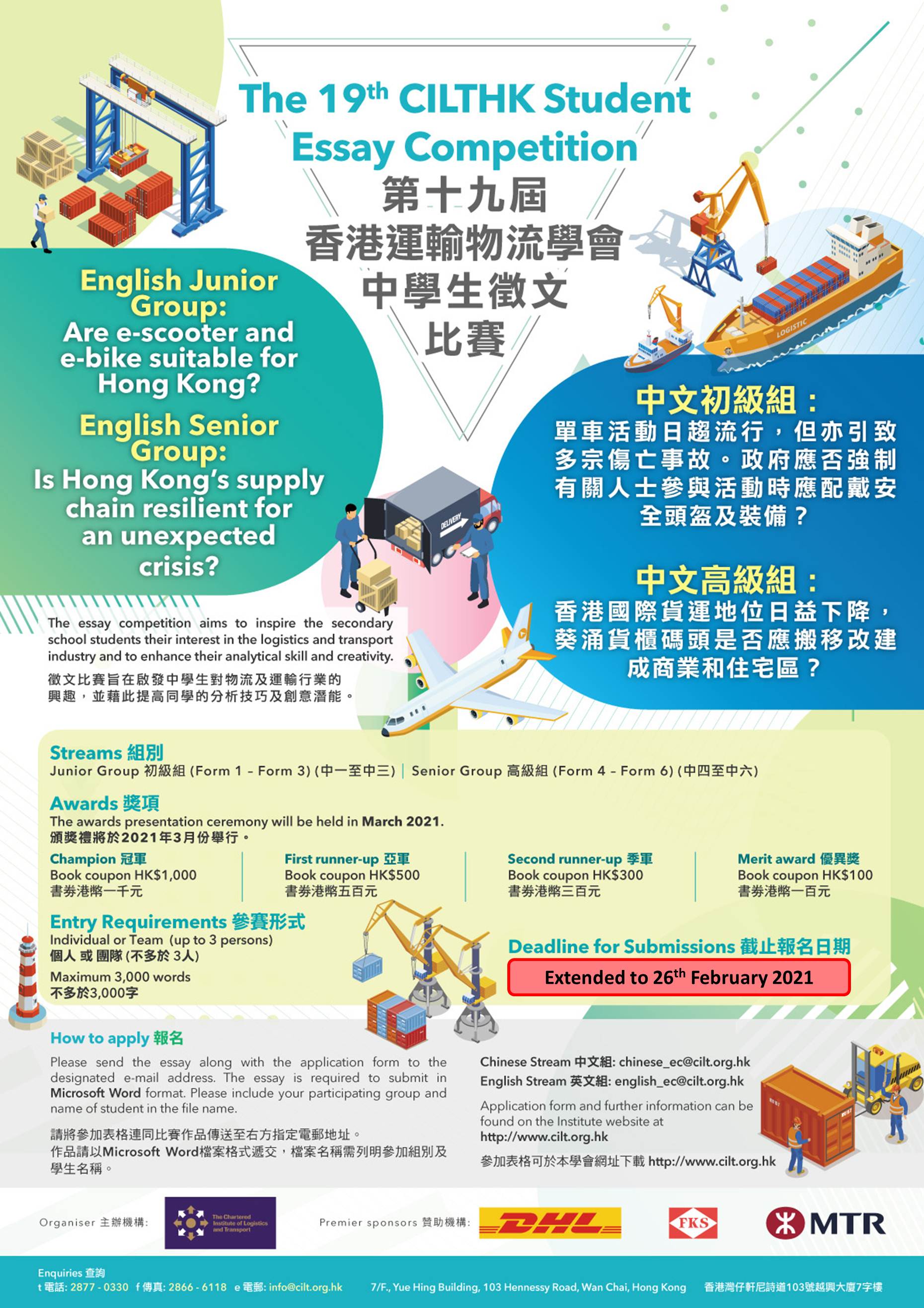 The essay competition aims to inspire the secondary school students their interest in the logistics and transport industry and to enhance their analytical skill and creativity. 徵文比賽旨在啟發中學生對物流及運輸行業的興趣,並藉此提高同學的分析技巧及創意潛能。
